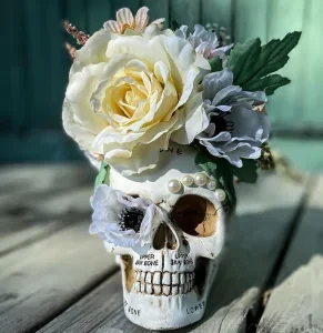 Inside, there’s always a way to go overboard with decor. But, hey, maybe pass on that stretchy faux spider web stuff (there are enough spider webs in the world, do we really need to add more?) and opt for a slightly scary but classy little bouquet of boo-tiful flowers instead.