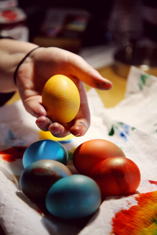 There are “dozens” of ways to do this activity, but the first step remains the same: boil eggs for about 10 minutes and let them cool under running cold water. Dry off the eggs, dig out the crayons, and set up bowls with dissolved dye in each. Draw designs on eggs and carefully dip them into the bowl of your choice. Let dry. If you’re a fan of hard-boiled eggs, this is a great Easter morning protein boost!