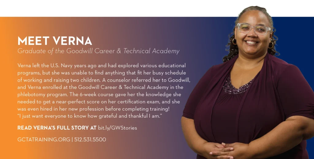 The GCTA Phlebotomy program provides unrivaled support to students from the moment they step into the classroom to graduation day and beyond. With wraparound services including career placement upon certification, the phlebotomy program is a shining example of Goodwill Central Texas’ overarching mission to transform lives through the power of work.